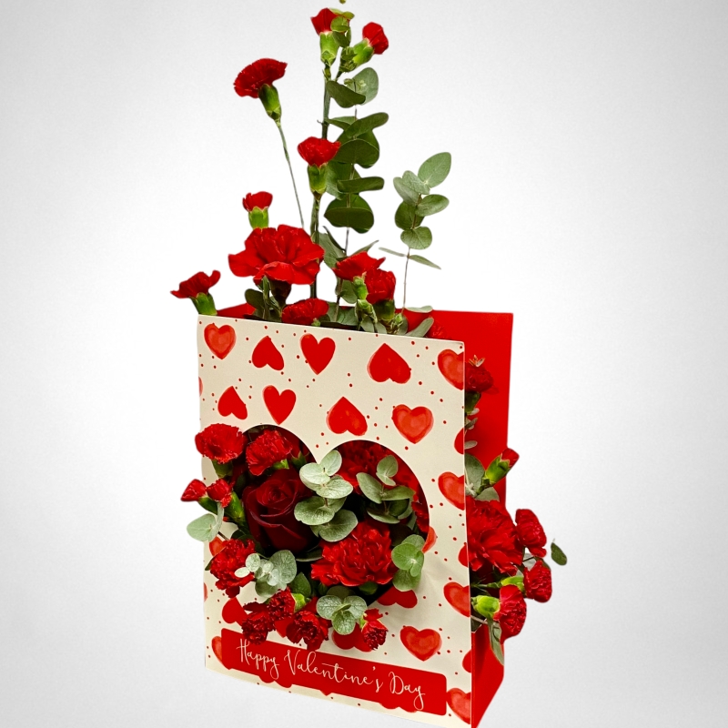 Introducing our exquisite Valentine's living card, a stunning arrangement that captures the essence of love and beauty. Adorned with vibrant red carnations, cheerful red spray chrysanthemums, and a single elegant rose at its heart, this unique creation is further enhanced by lush foliage that gracefully climbs out of the card. Perfectly designed to convey heartfelt sentiments, this arrangement is exclusively available for local delivery and in-store collection. Surprise your loved one with this beautiful gift for Valentine's Day, making the occasion truly unforgettable.