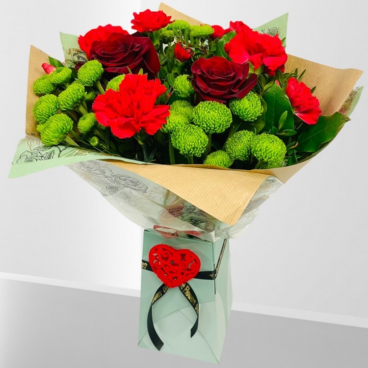 The PETITE Green Gift Box with Red Filigree Heart STANDARD is beautiful for Valentines Day . Created with Red Carnations, Red Carnation Spray,Red Roses, Pink Lily, Green Chrysanthemums, Red Rose and displayed in the Green Gift Gift Box with Red Filigree Heart.