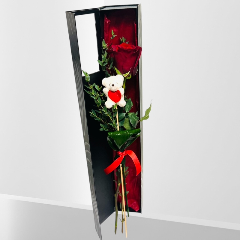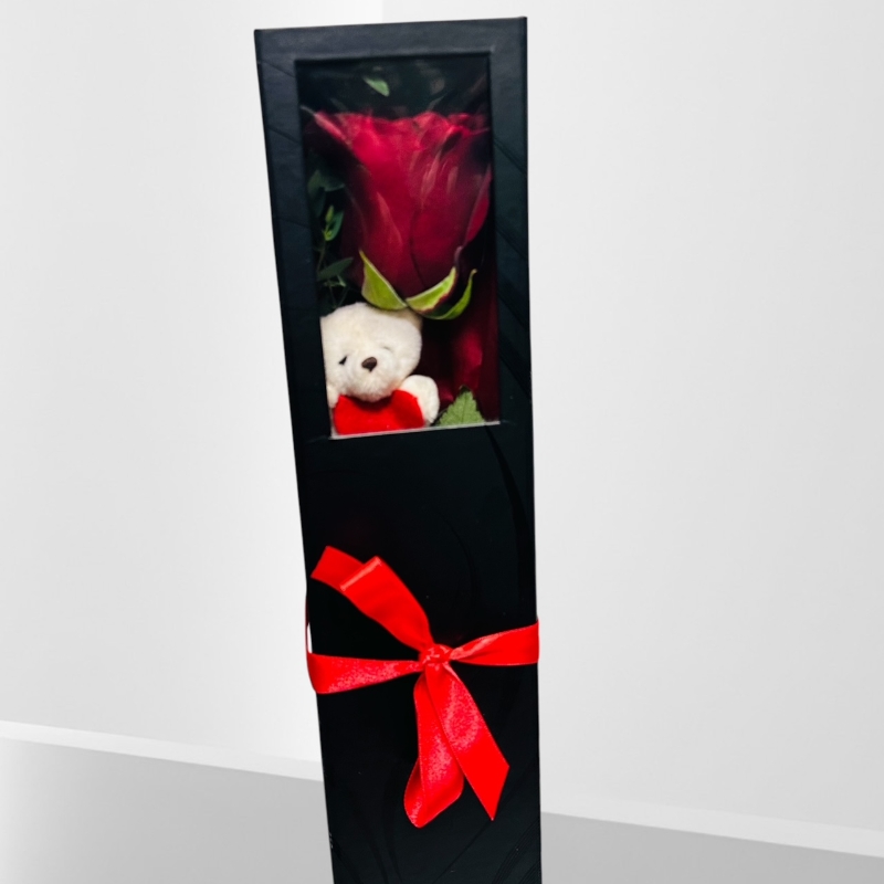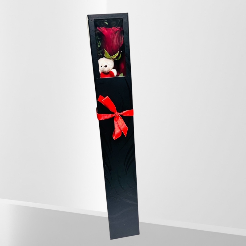 This exquisite arrangement features a single rose and a charming teddy bear, elegantly presented in a sleek black long box finished with a delightful red ribbon. Perfect for expressing your affection this Valentine's Day, it’s a heartfelt way to say "I love you." The rose is carefully delivered in a tube filled with water, ensuring its freshness and vibrant beauty, making this gift not only memorable but also long-lasting. Surprise your loved one with this thoughtful and romantic gesture that speaks volumes of your feelings.