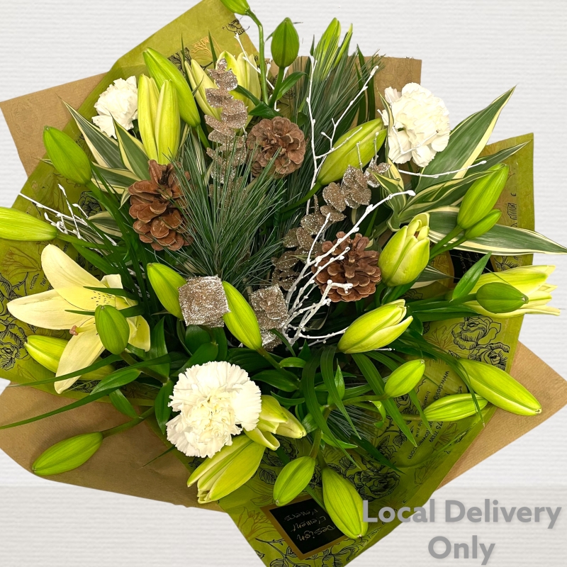 The LOCAL Winter Arctic Lily & Cone Hand-tied which has been hand crafted by our florists . This stunning winter hand-tied is created with White Asiatic Lilies , White Carnations , Pine Cones , Gold Glittered Eucalyptus , White twigs and Mixed Christmas Foliages . The design is displayed the Green Pine Gift box finished with our silver Kraft paper .