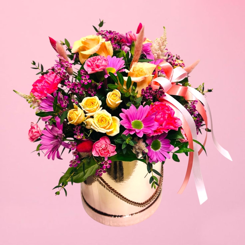 This Mother’s Day, surprise her with our stunning Rose Metallic Hat Box arrangement, featuring a lush collection of peach and pink flowers, including elegant roses, delicate spray roses, charming carnations, and whimsical wax flowers, beautifully complemented by a touch of dried florals. Finished with a luxurious satin ribbon in coordinating hues, this exquisite design is elegantly presented in our new rose metallic hat box. Available for local delivery, consider adding a delightful card, gourmet chocolates, or a bottle of wine to make your gift truly unforgettable!